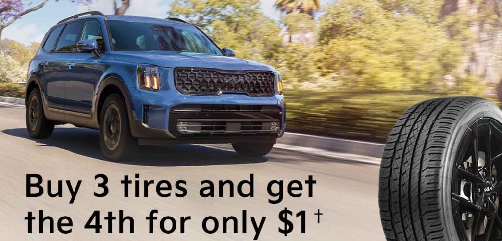 †Valid March 1-April 30, 2026. Valid at participating Kia dealerships. Offer is only good on eligible tires. For a list of all eligible tires, please contact your Kia Service Consultant. Excludes hazardous waste fee (except California), tax, and shop supplies, where applicable. Offer not valid on previous purchases. May be combined with select offers. Offer applies to eligible original equipment manufacturer, winter, and original equipment alternative tires only. Installation charges extra; required on all four tires. Installation of all four tires must be completed by May 7, 2026. Offer has no cash value. Additional terms and conditions apply; see your Kia Service Consultant for details. Customer must present offer at time of write-up. Void where prohibited by law. Offer valid in the United States only. Expires: 04/29/2026
